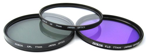 Zeikos 77mm Glass Multi Coated 3 piece Filter Kit consisting of an Ultra Violet (UV), Circular Polarizer (CPL), and a Fluorescent (FLD) Filter. They have Black metal rings to match most cameras. Protective hard case included.